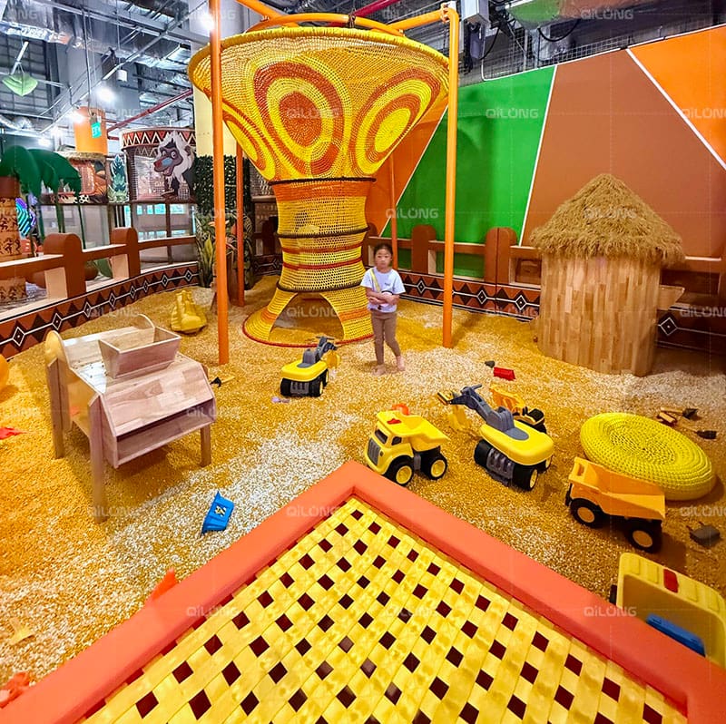 Quest'area è piena di sabbia e comprende una grande struttura intrecciata a forma di cesto. Numerosi camion giocattolo e veicoli da costruzione sono sparsi ovunque, insieme a una piccola capanna con tetto di paglia e mobili in legno, stimolando il gioco creativo e tattile.