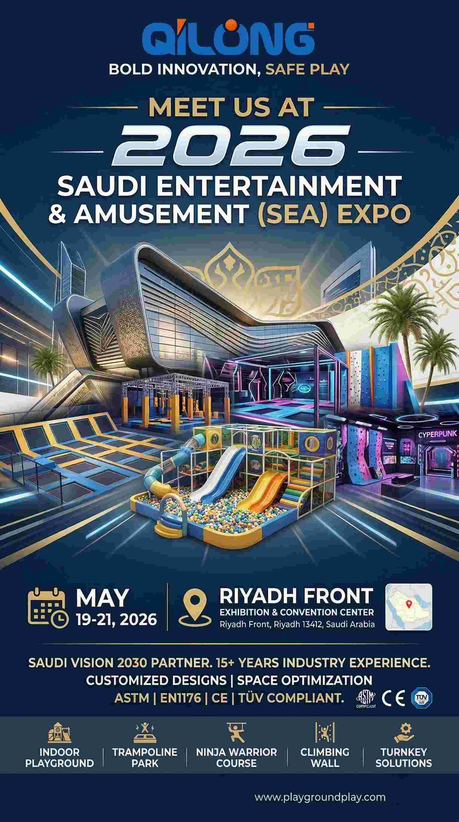 Riyad, Arabia Saudita — Qilong Amusement Group (Playgroundplay), produttore leader a livello mondiale di attrezzature per il divertimento al coperto di alta qualità, è entusiasta di annunciare la nostra partecipazione all'attesissimo Fiera saudita dell'intrattenimento e del divertimento (SEA Expo) 2026.