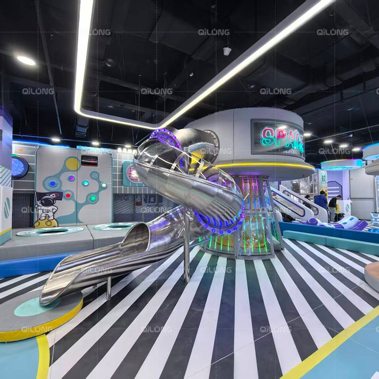 Uno scivolo a spirale metallico lucido si snoda in modo spettacolare, permettendo ai bambini di "volare attraverso le galassie", mentre gli scivoli trasparenti con luci incorporate offrono un tocco futuristico. Entrambi sono progettati con bordi arrotondati e atterraggi morbidi per la sicurezza.