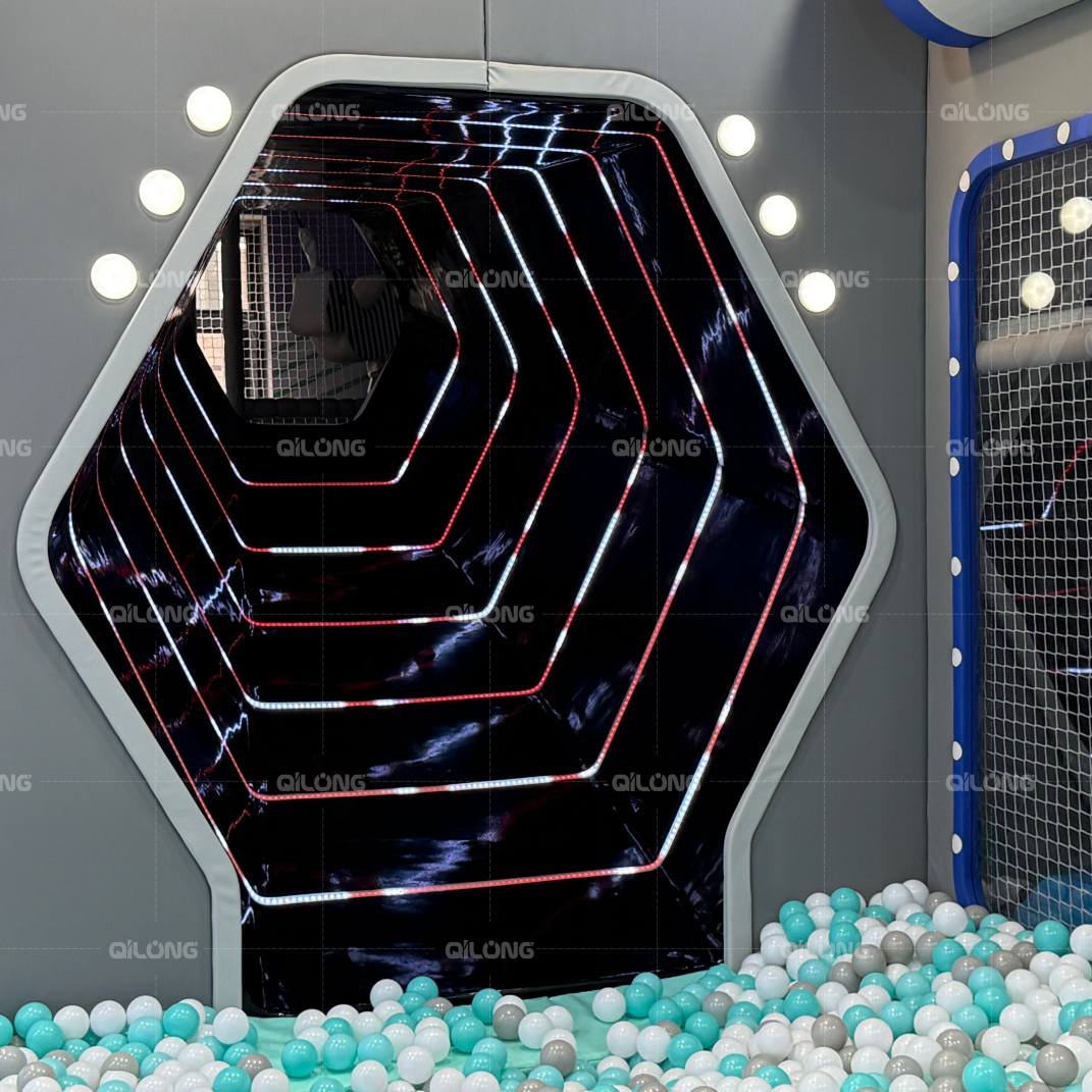 Un tunnel esagonale a LED (rivestito da strisce luminose rosse e bianche) conduce a una piscina di palline colorate, che incoraggia i bambini a "esplorare pianeti alieni".